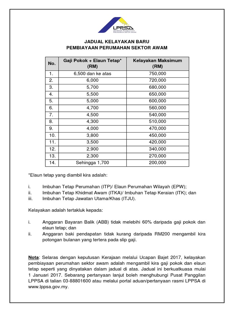 Jadual Kelayakan LPPSA Bagi yang ingin membina rumah dengan skim pinjaman LPPSA adalah penting untuk anda ketahui dan mengenalpasti terlebih dahulu jumlah kelayakan berdasarkan gaji hakikigaji pokok elaun. Kementerian Kesejahteraan Bandar Perumahan dan Kerajaan Tempatan. LPPSA yang sebelum ini dikenali sebagai Bahagian Pinjaman Perumahan BPP telah ditubuhkan sejak tahun 2016.